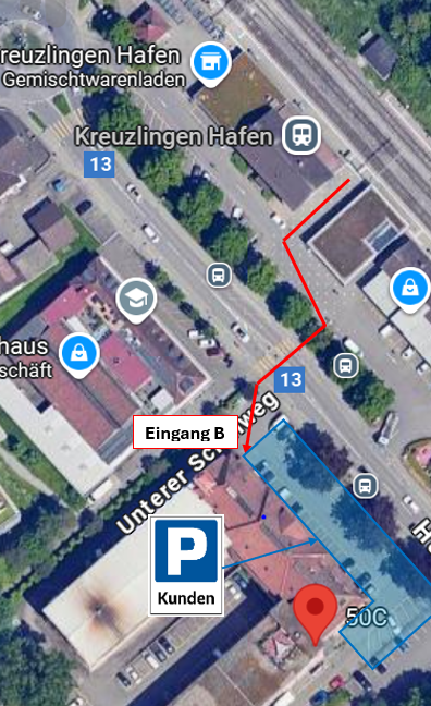 Mit dem Bus oder der Bahn nach Kreuzlingen Hafen. Das Geschäftshaus Hafencenter liegt in Sicht- und Gehdistanz.